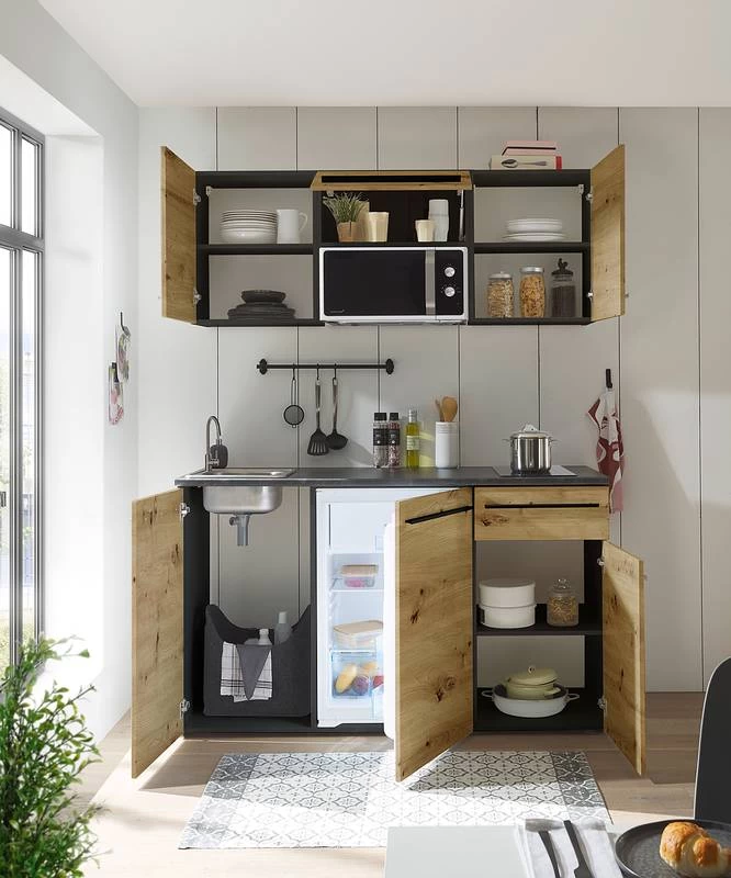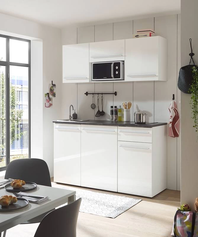 - Cuisine composée de 2 meubles hauts de 50 cm, 1 meuble haut de 60 cm, 1 meuble sous évier de 50 cm, 1 meuble bas de 60 cm et 1 meuble bas de 50 cm