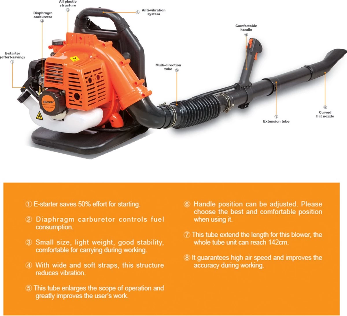 Le Herzberg HG-80 est un puissant souffleur de feuilles à dos à essence qui rendra le nettoyage de votre jardin et de votre pelouse très efficace et facile. Bien construit et bien conçu, ce souffleur de feuilles est doté d’un puissant moteur 2 temps délivrant une vitesse maximale de 251 mph et un débit d’air maximal de 434 cfm. Le moteur sans balais optimise la durée de fonctionnement et offre une durée de vie du moteur plus longue. La conception unique du moteur réduit les émissions nocives jusqu’à 65 % et garantit une efficacité énergétique de 20 %. Équipé d’une technologie à faible vibration, ce mécanisme absorbe les vibrations et évite les contraintes fréquentes sur les bras, les mains et le corps. La conception ergonomique réduit la fatigue et les marques corporelles, tandis que le harnais confortablement rembourré assure un ajustement optimal et un confort supérieur. Il émet également peu de bruit pendant le travail, même dans les zones résidentielles. Ce souffleur a une vitesse variable et un régulateur de vitesse afin que vous puissiez facilement régler la vitesse pour n’importe quelle tâche, tandis que la conception intuitive des commandes est facile d’accès. La longueur du tube est entièrement réglable pour de meilleures performances. Rendez toutes les tâches de nettoyage plus faciles et plus efficaces, parfaites pour les travaux de pelouse et de jardin avec le souffleur de feuilles à essence Backpack, uniquement de Herberg.